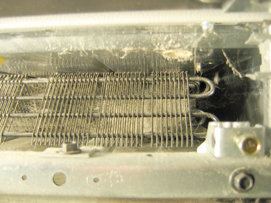 But that led to the next question: How the hell do you clean layers 2 through eleventy-two? You can't get at it from the bottom without emptying the fridge and tipping it back, so that's not how. I suppose you could have a really bendy vacuum hose that could go down the side and into the gaps, but that'd be a pretty exotic tool for your typical fridge owner. The right way would be for the side of the fridge to have a panel that comes off, allowing access to the channels between the layers. But no, the side is a single piece from floor to top.