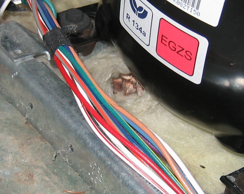 But what's this? See that little dark thing in the yellow insulation, just under the compressor? And see those little tell-tale bits of mouse dirt? (the polite way to say "shit") Someone's been using my fridge as a house!